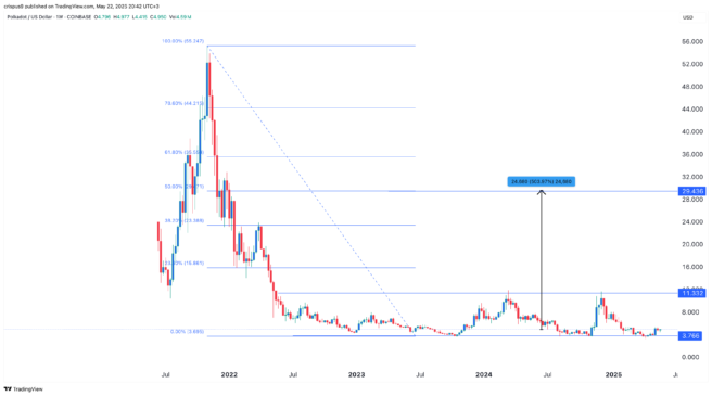 DOT has also formed a triple bottom at $3.76, a level it has not dropped below since 2023. Therefore, the most likely outlook is a rebound to at least $11.32, a gain of 132% from the current level. A move above that price would signal further upside, potentially to the 50% retracement level at $30, an increase of 500% from its present value.