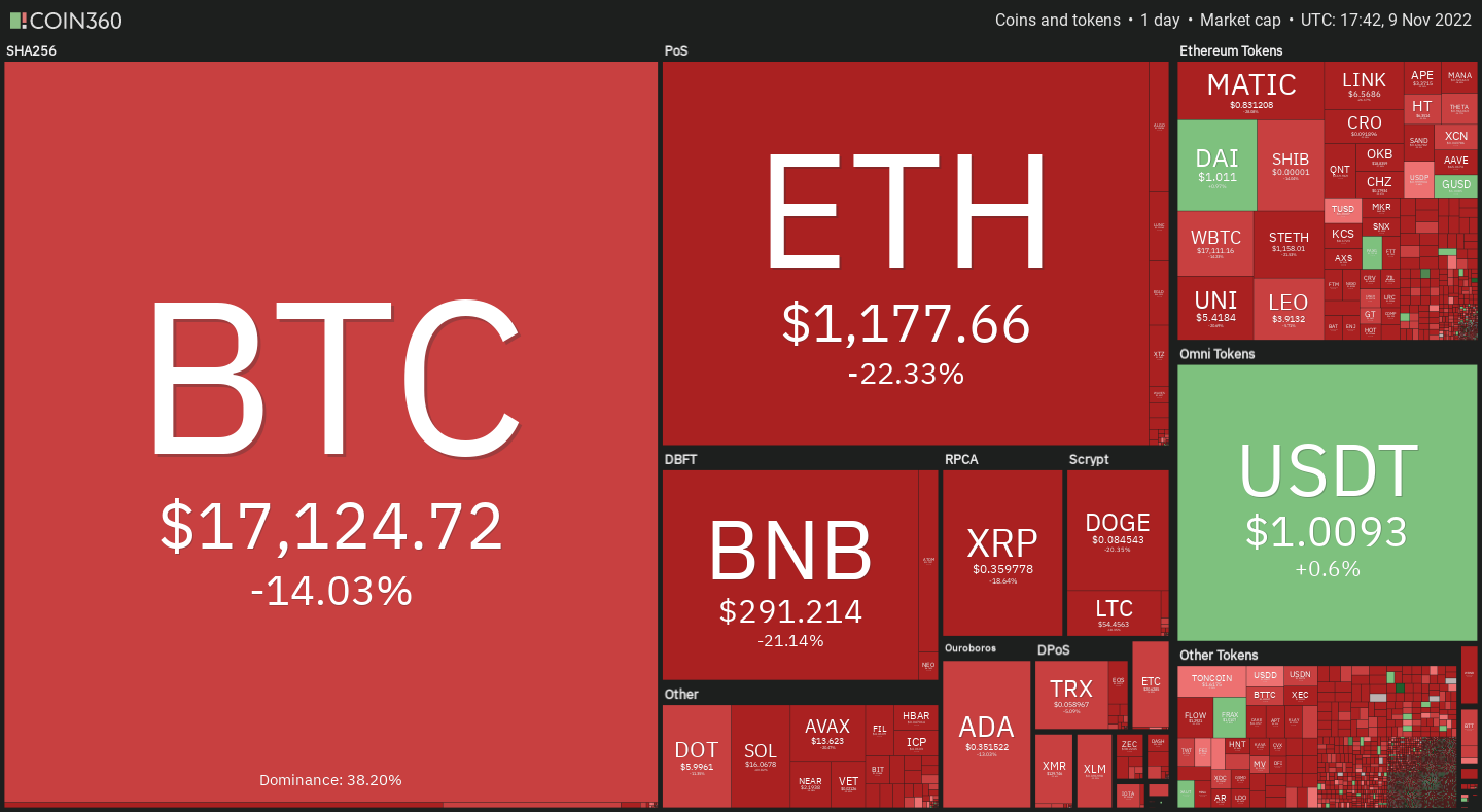 Crypto markets crumbled for a second day as the fallout from FTX’s liquidity troubles continued to negatively impact investor sentiment. Bitcoin (BTC) price fell to a new yearly low at $16,800 as anonymous unconfirmed sources suggested that after a closer review of FTX’s books, Binance could back out of their agreement to acquire the beleaguered exchange. Crypto market performance. Source: Coin360.com Other factors having a potential impact on the market is a wave of successive liquidations in Solana’s DeFi markets. Earlier in the day, Crypto.com exchange emailed its users to…