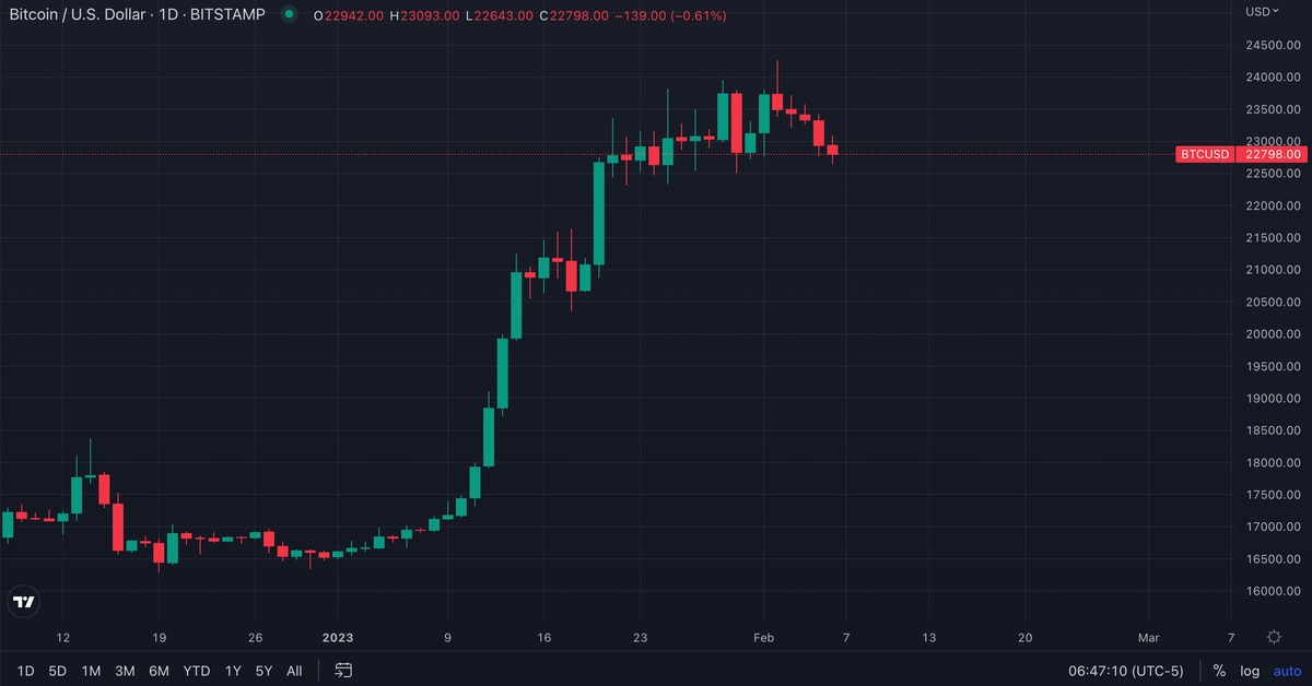 The latest price moves in bitcoin (BTC) and crypto markets in context for Feb. 6, 2023. First Mover is CoinDesk’s daily newsletter that contextualizes the latest actions in the crypto markets. Source