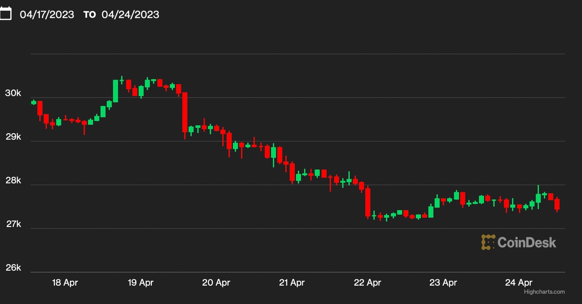 The leading cryptocurrency by market value fell by 9% to $27,600, registering its largest single-week percentage loss since early November, according to data from TradingView and CoinDesk. The yield on the 10-year U.S. Treasury note rose by six basis points (bps) to 3.58%, its second straight weekly gain, denting the appeal of risk assets, including cryptocurrencies. Original