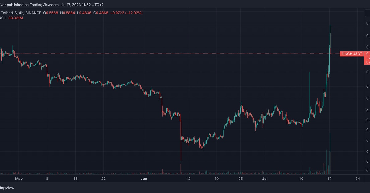 1inch Token Surges 58% as Daily Trading Volume Spikes to 20-Month High; Investor Moves $3.7M to Binance