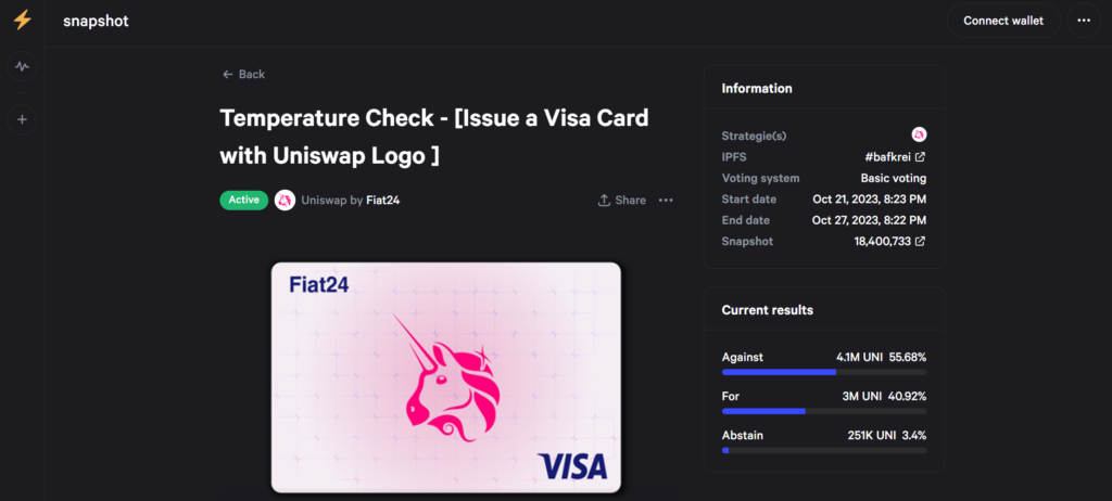 Swiss-regulated blockchain bank Fiat24 issued a temperature check on the Uniswap DAO to approve a branded Visa card, though governance delegates have trademark concerns. Fiat24, which runs atop Ethereum L2 network Arbtrium, would issue a Visa card featuring Uniswap’s logo if the decentralized autonomous organization (DAO) governing crypto’s largest on-chain exchange or DEX approves its proposal. The card would be available in 27 markets across European Union countries with additional plans to expand toward Latin America and Southeast Asia. There is no effort or cost for the Uniswap DAO. We…