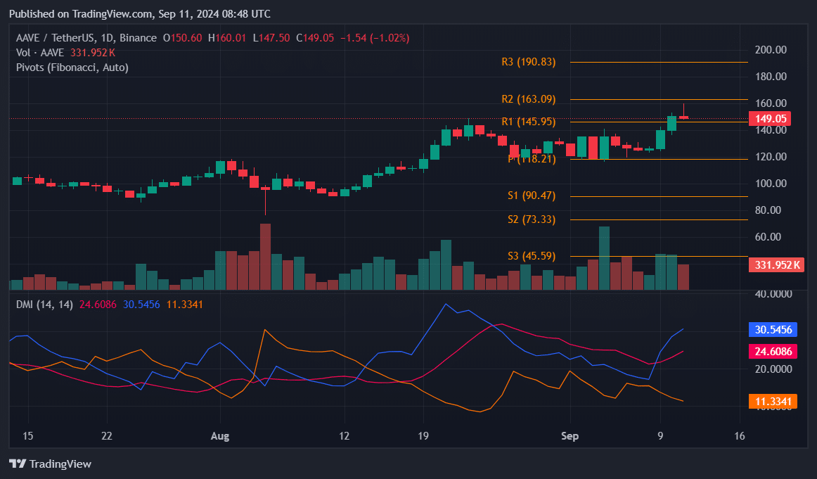 Aave has emerged as the top gainer in the cryptocurrency market following a remarkable comeback that began three days ago amid market uncertainty. Aave (AAVE) recorded a sharp 11% surge over the past 24 hours. Following its impressive run, Aave peaked at $160 earlier this morning for the first time since the Terra collapse in May 2022. AAVE 1D chart – Sept. 11 | Source: crypto.news While the asset has faced resistance at this psychological level, it looks to maintain the $150 price point. Despite this challenge, Aave is currently…