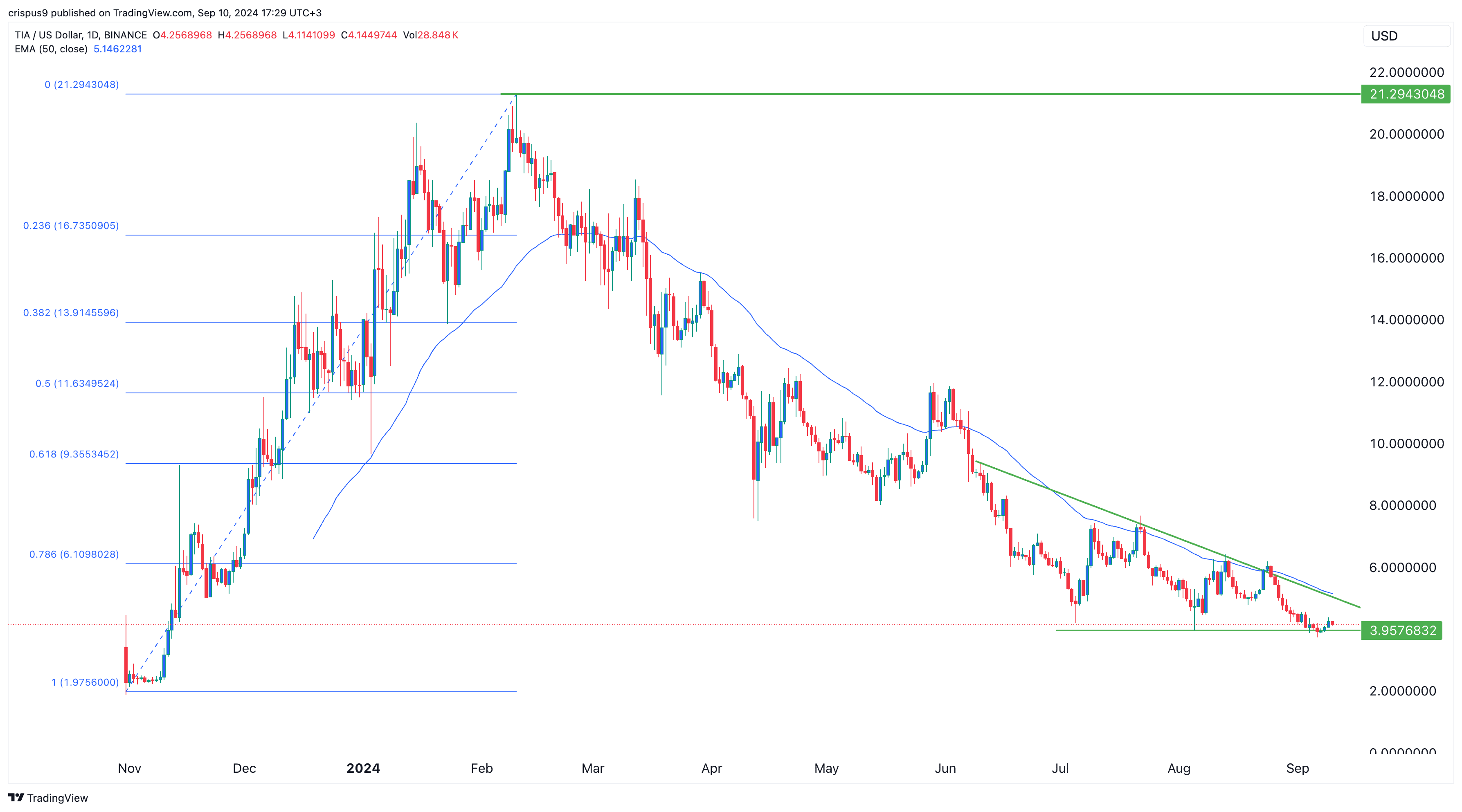 Celestia price continued its sell-off this week and is hovering at its lowest point since November 2023, ahead of a major token unlock. Celestia (TIA) dropped to $4.15 on Sept. 10, down by more than 80% from its highest level in February. This decline has brought its market cap to over $868 million, down from $3.2 billion earlier this year. Celestia’s sell-off happened as Bitcoin (BTC) and other altcoins lost momentum. Bitcoin has dropped by over 23% from its highest level this year, while Ether has fallen by 43%. Celestia’s…