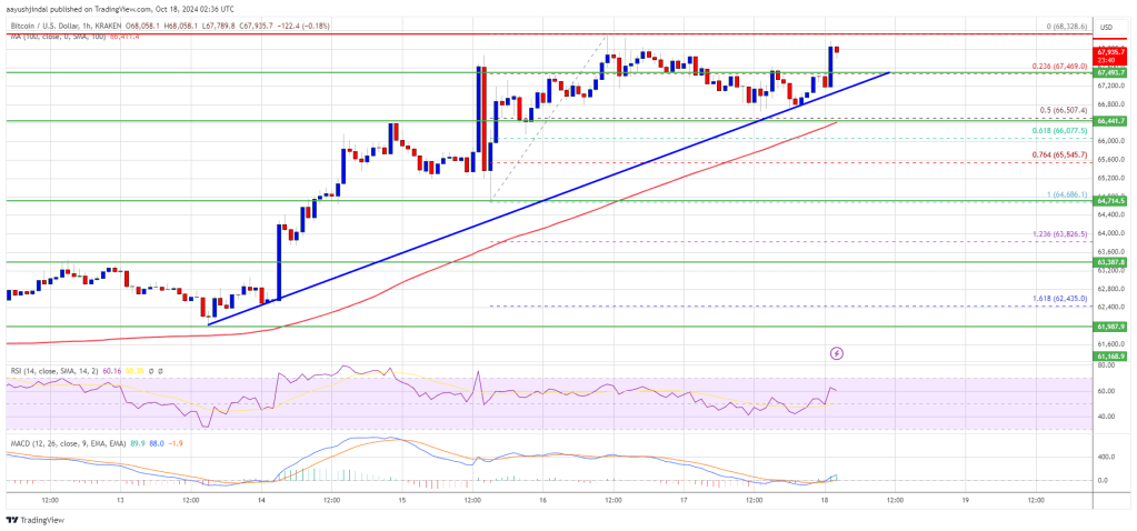 Bitcoin price holding gains above the $67,000 resistance zone. BTC is now consolidating and aiming for more gains above the $68,350 resistance. Bitcoin remained stable and extended gains above the $67,500 zone. The price is trading above $67,400 and the 100 hourly Simple moving average. There is a key bullish trend line forming with support at $67,400 on the hourly chart of the BTC/USD pair (data feed from Kraken). The pair could rally further if there is a close above the $68,200 resistance zone. Bitcoin Price Eyes More Upsides Bitcoin…
