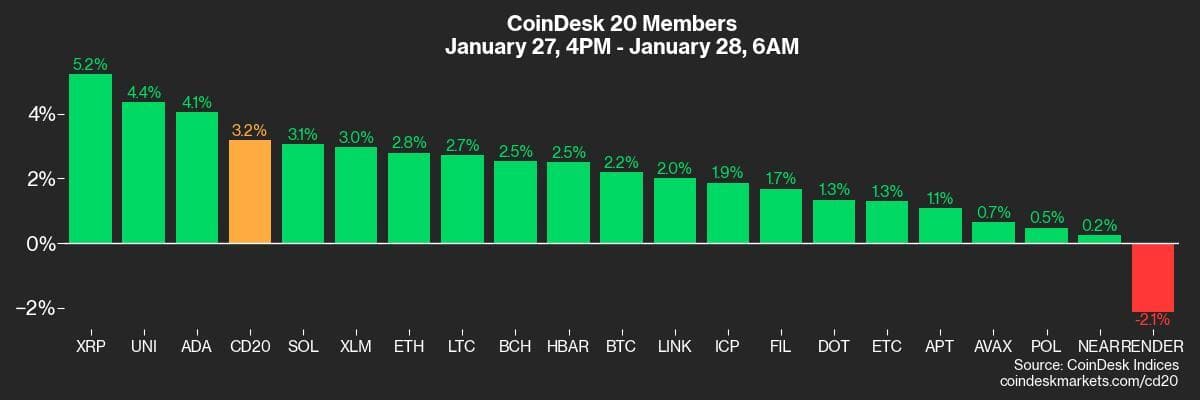 By Omkar Godbole (All times ET unless indicated otherwise) The crypto market is showing signs of stabilizing, with bitcoin recovering to $102,000 and positive signals from futures tied to the Nasdaq. Leading the recovery among major cryptocurrencies is XRP, up 11%, followed by SOL with a 7% increase. AI coins, hit hard on Monday, are posting gains of as much as 4%. Risk sentiment is likely being supported by skepticism surrounding the claims of Chinese tech startup DeepSeek, which asserts it spent only $6 million to develop its competitor to…