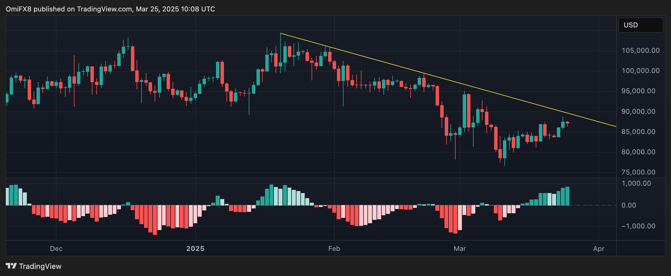 By James Van Straten (All times ET unless indicated otherwise) Risk-assets have a spring in their step. Bitcoin (BTC) is trading above $87,000 and the S&P 500 reclaimed its 200-day moving average for the first time since March 10. However, volatility is expected to rise ahead of Friday’s quarterly options expiry, with over $12 billion in notional value set to expire on Deribit with a max pain price at $85,000. Most open interest, meantime, centers around $100,000 call options. President Trump is deploying new trade war tactics, introducing “secondary tariffs”…