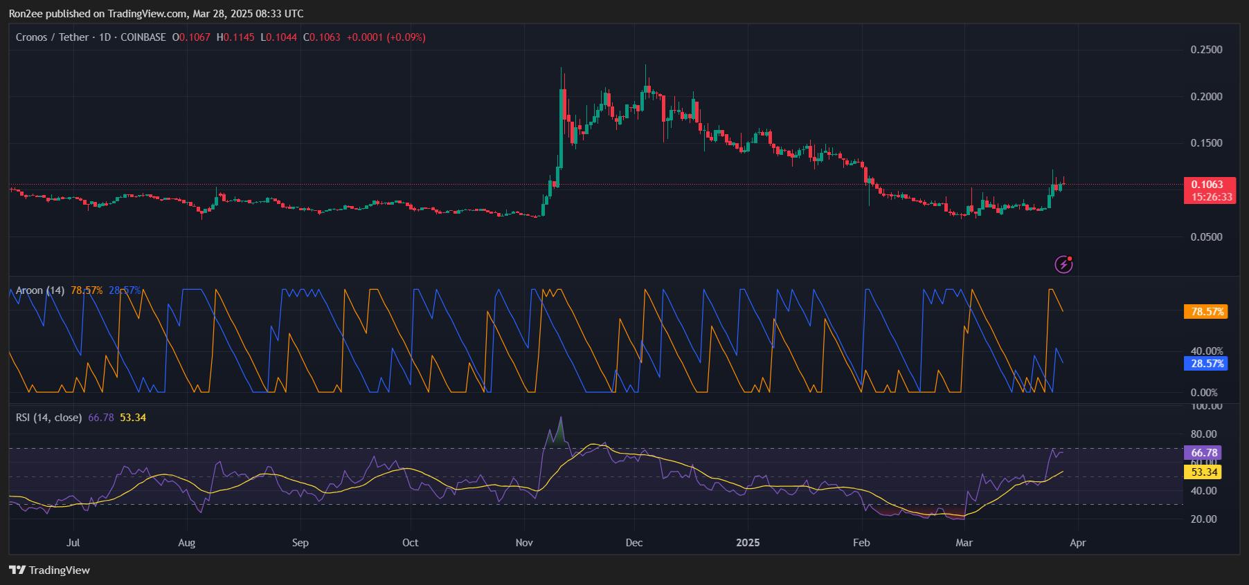 CRO rallied as high as 17% after the US SEC formally concluded its investigation into Crypto.com. However, most of these gains were quickly erased amid broader market uncertainty. According to crypto.news data, Cronos (CRO) jumped from $0.097 to as high as $0.114 on Mar. 28 before cooling off to around $0.1064 later in the day during Asian trading hours. Its market cap hit $2.94 billion, and daily trading volume spiked by 71%, with about $138 million worth of CRO changing hands. CRO got a boost as the community turned bullish…