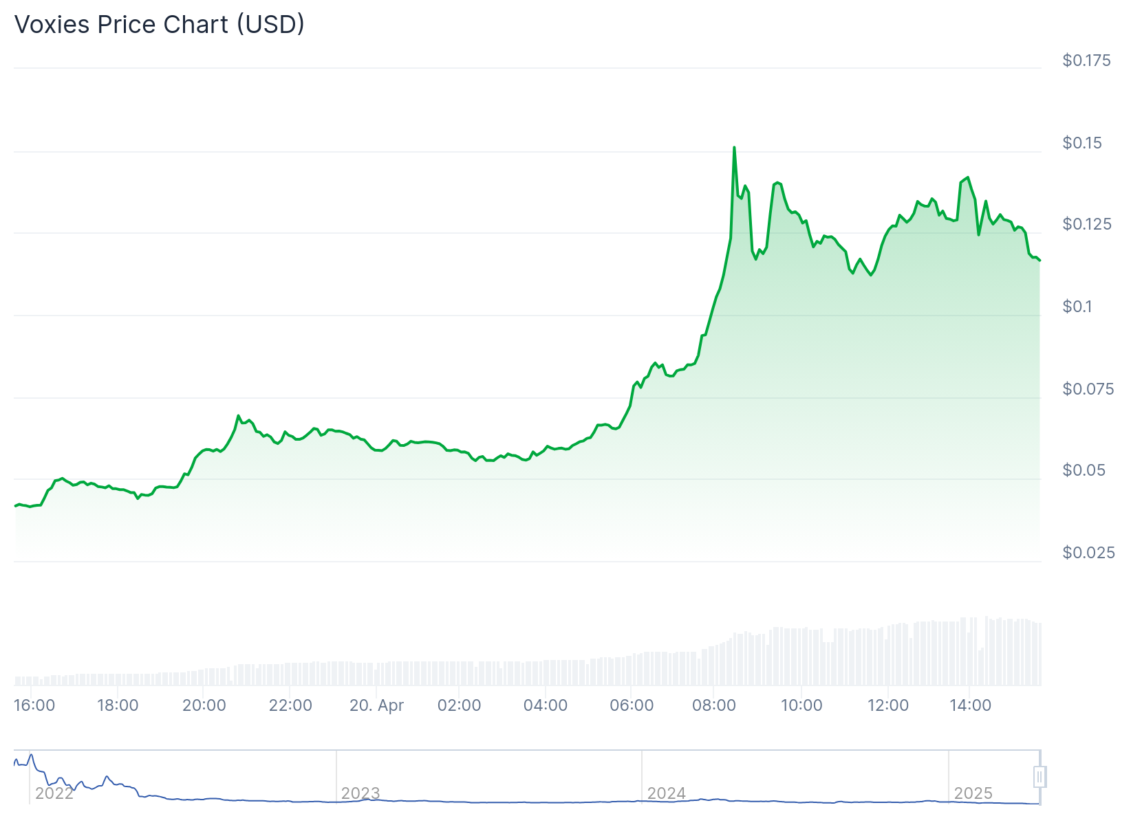 Several altcoins are posting massive gains despite Dogecoin’s downward trend, with Voxies (VOXEL) and Broccoli leading with triple-digit increases over the past 24 hours. Voxies has surged 178.8% in the last 24 hours, trading at $0.1166 from a low of $0.04152. This recent surge continues VOXEL’s pump of 340% over the past week. Trading volume has also jumped alongside the price, touching $463.44 million, which is a 577.79% increase in just 24 hours. VOXEL 24H price chart | Source: CoinGeko Analyst Ash Crypto cautioned on X: “This is the new…