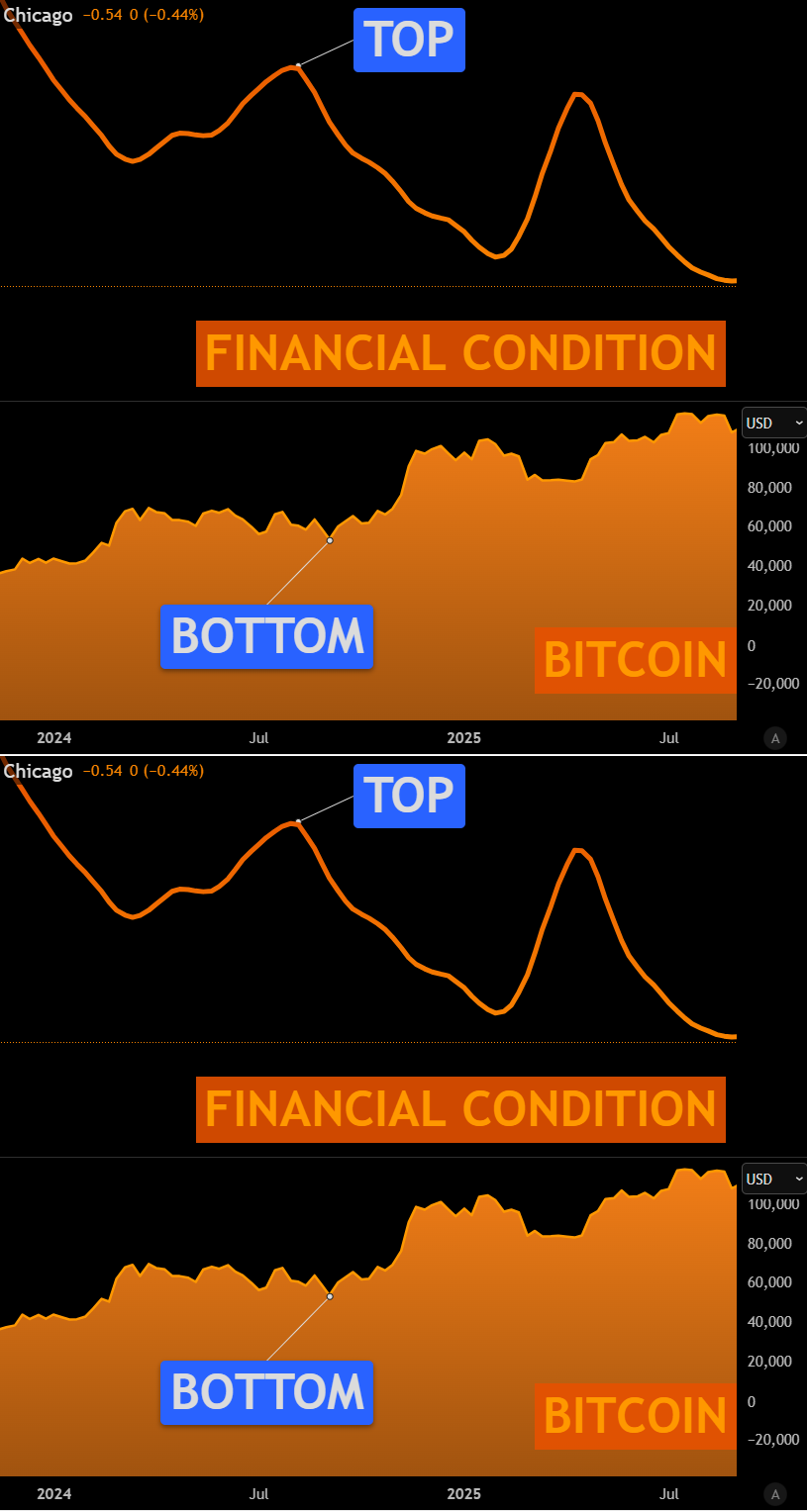 This signal appeared in late 2022 and mid-2024, both ahead of sharp rallies. Historically, each 0.10-point decline has aligned with roughly 15%–20% upside in Bitcoin, with deeper NFCI readings marking prolonged BTC uptrend phases.