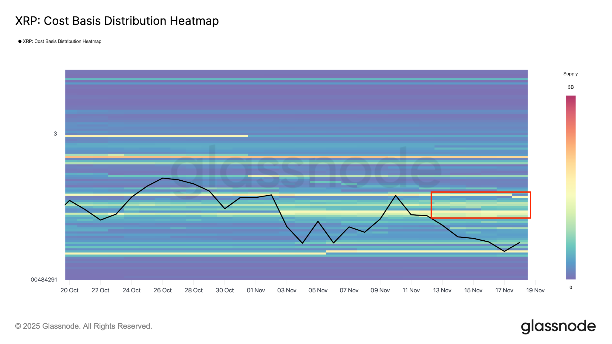 The Glassnode distribution heatmap shows that a large cluster of supply sits between $2.38 and $2.40 (embraced by the 100-day SMA and the triangleโs resistance line), where nearly 3.23 billion XRP were acquired. This marks an area of stiff resistance for XRP, adding to the tailwinds.