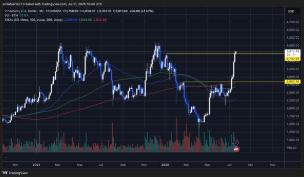 The 50-day, 100-day, and 200-day moving averages are all trending upward, further validating the current uptrend. ETH is well above all key SMAsโspecifically the 200-day SMA at $2,824.88โwhich now acts as solid macro support. The next test lies just above current levels at the $3,850โ$4,000 zone, a historically significant resistance area. A breakout here could spark a larger move, potentially leading to new yearly highs.