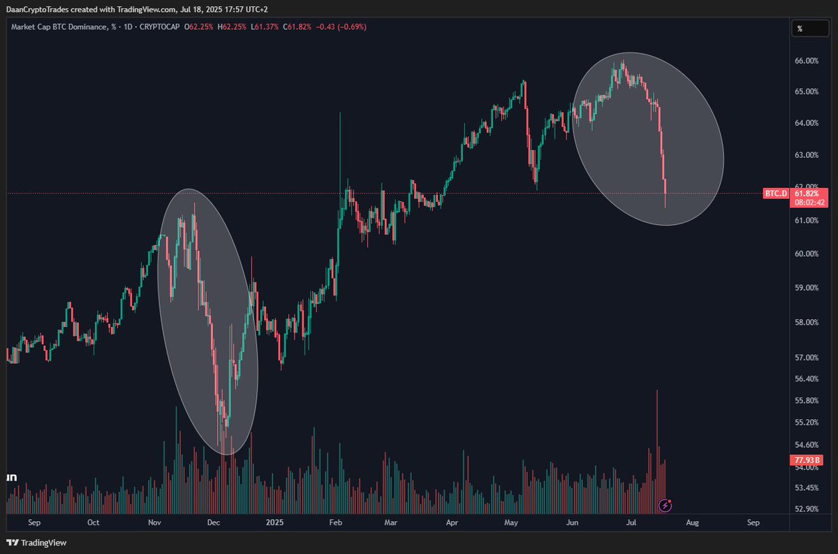 “$BTC.D Has only dropped 4.5% from the local highs and we can already see its impact on alts and ALT/BTC pairs,” popular trader Daan crypto Trades observed on X Friday.