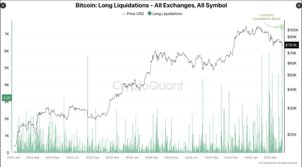 Bitcoin investors recorded heavy losses this week following the largest long position liquidation in the current bull market. On April 6, more than 7,500 BTC with a value exceeding $500 million were erased across prominent trading exchanges as prices dropped from $83,000 to $74,000.