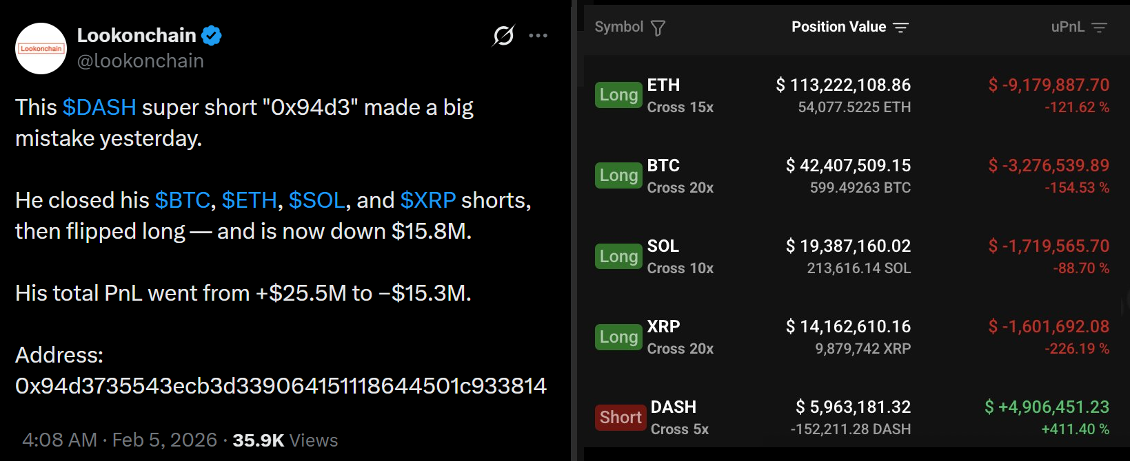 The same user was flagged by X user ‘lookonchain’ on Feb. 5 after taking a massive loss on leveraged bullish bets on Ether (ETH), Bitcoin, Solana (SOL), and XRP (XRP).