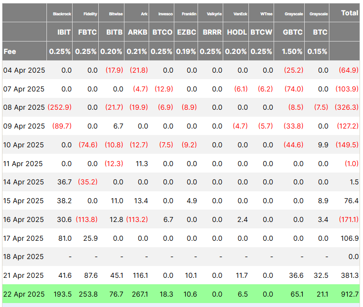 The US spot Bitcoin (BTC) ETFs received over $912 million worth of cumulative net inflows on April 22, marking the highest daily investment in over three months since Jan. 21, Farside Investors data shows.