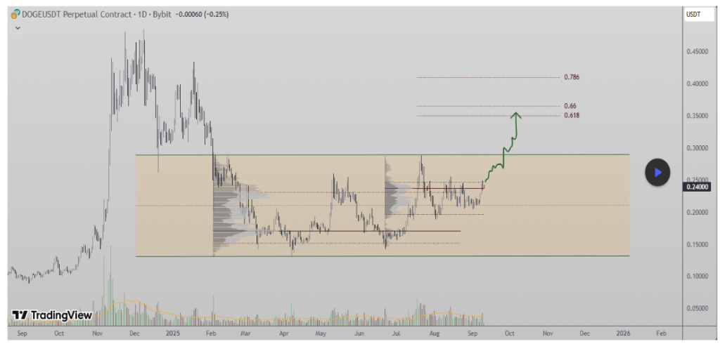 In this case, the analyst noted that a successful breakout above the point of control at $0.25 opens the path toward the 0.618 Fibonacci retracement level. This level, which is positioned around $0.35, stands out as the primary upside target in the current setup.