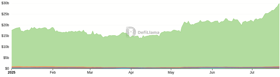 However, data from DefiLlama shows Aave’s current TVL has dipped to about $33.5 billion, placing it second behind liquid staking platform Lido, which holds $34.3 billion in assets.