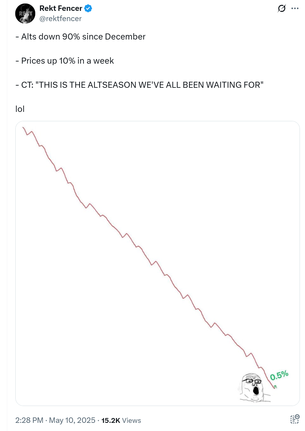 However, skeptics remain. Commentator Rekt Fencer pointed out that most altcoins have been down 90% since December. A modest 10% bounce this week sparked exaggerated optimism, prompting him to mock the rally. “This is the ALTSEASON we’ve all been waiting for,” he joked.