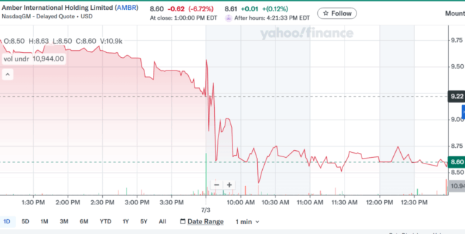 At press time, Amber Internationalโs stock managed to see modest gains of 0.12%, rising from its previous closed market price at $8.60. Earlier today, the stock experienced a sharp spike, bounding up to as high as $9.56. However the peak was short lived as it took a nosedive down to $8.40.