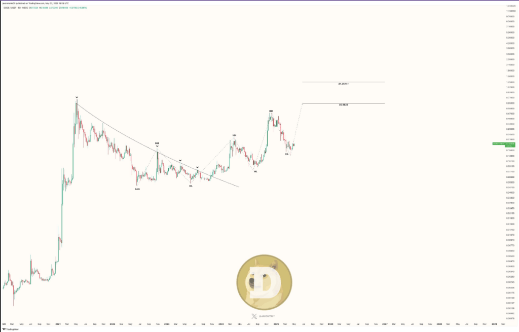 According to analyst Javon Marks, a key trendline gave way in late 2023. This line had capped Dogecoin since its $0.70 peak. He says the break ushered in higher highs and higher lows.