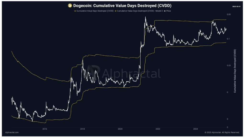 One of Abbé’s key points is that Dogecoin’s price cycles have consistently followed a similar pattern of long sideways stretches followed by sudden vertical expansions. This cycle structure can be seen in the cumulative value days destroyed (CVDD) chart. As shown in the chart below, Dogecoin’s price action stayed well within its accumulation zones before breaking higher in 2018 and then in 2021.