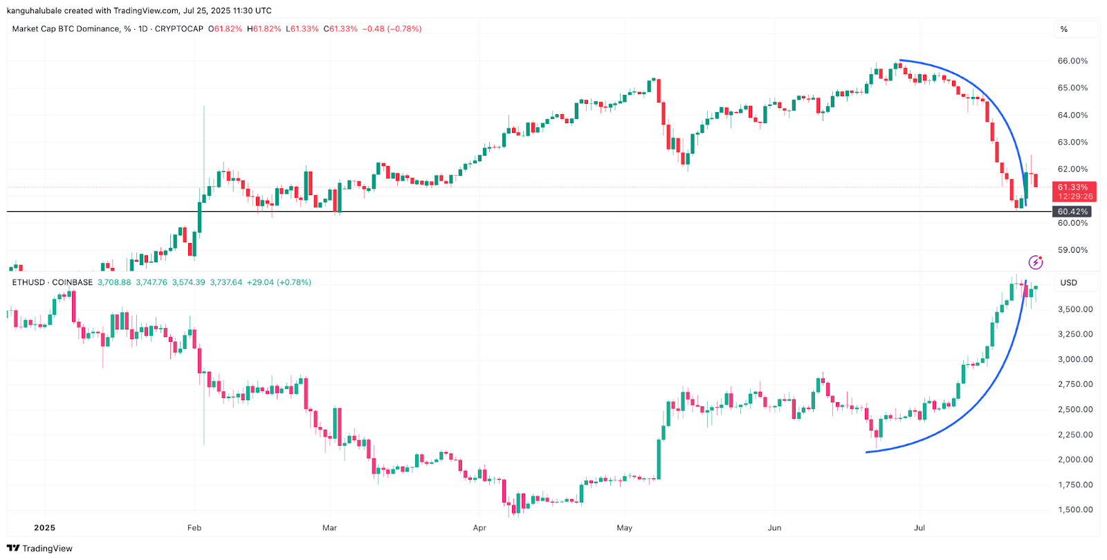 ETH price gained 77% in the same period, reflecting a negative correlation with BTC.D.