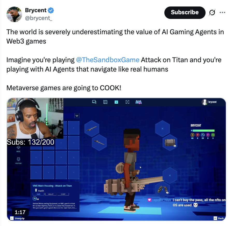 More recently, AI has become increasingly popular in Telegram blockchain games. In February, gaming network GOAT Gaming launched AI agents, which play games to earn crypto for you and bet on prediction markets.