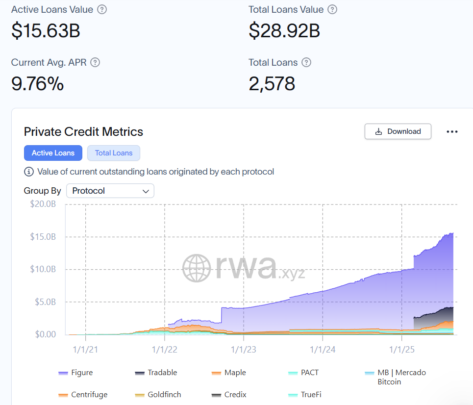 Tokenized private credit market metrics. Source: RWA.xyz