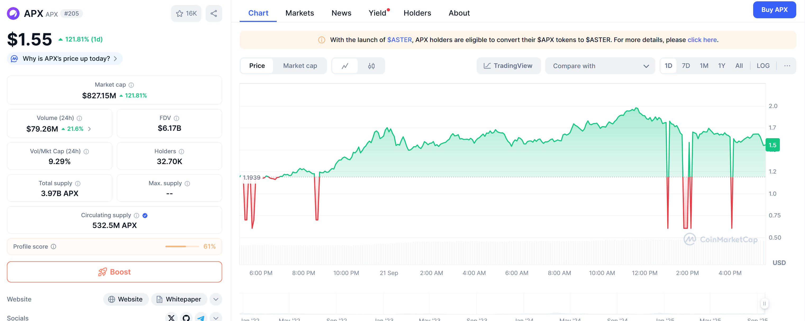 APX surged over 120% in the past 24 hours, briefly touching an all-time high of $1.98 on Sunday, according to data from CoinMarketCap. The rally pushed its market cap to $827 million, with daily volume hitting $79 million. The token is now up nearly 8,000% from its all-time low in 2022.