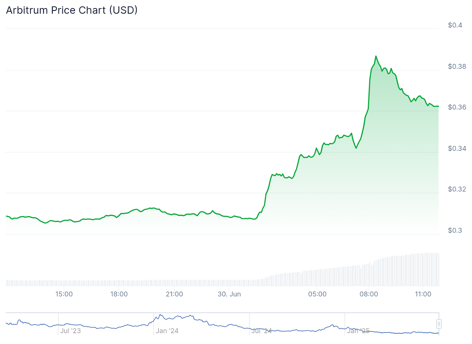 ARB climbed from around 31 cents at the time of Robinhood’s X post to hit an intraday high of 38.6 cents eight hours later at 10:30 pm UTC on Sunday.