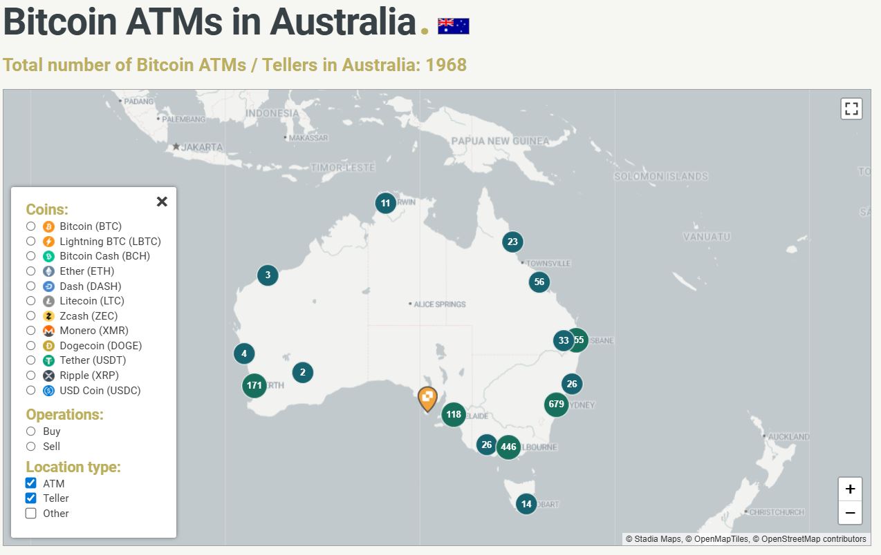 Australia has the worldโs third-largest number of crypto ATMs, with 1,968 and growing at last count.