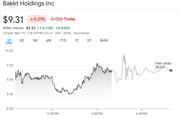 Bakkt shares closed mostly flat on March 19 and settled after the bell. Source: Google Finance