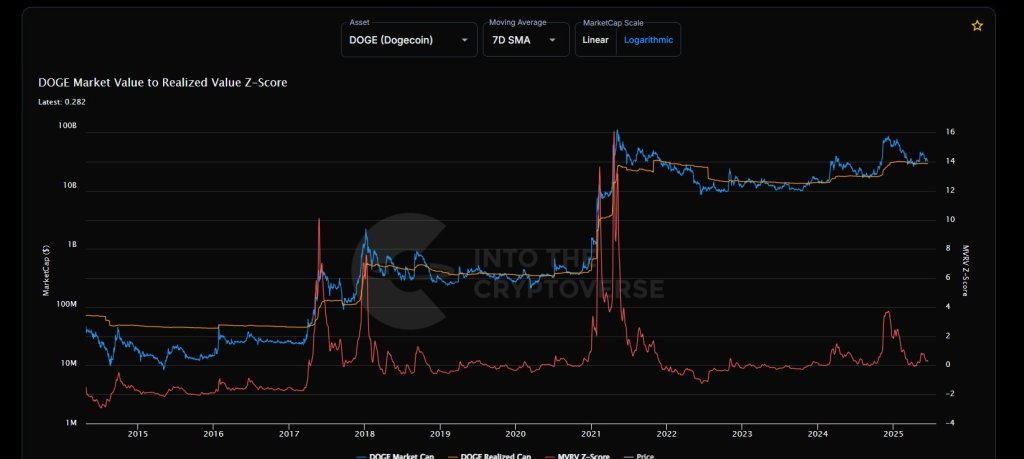 Dogecoin’s Market-Value-to-Realised-Value (MVRV) Z-Score is printing just 0.28 – a level normally associated with capitulation, not euphoria. Yet the price of the ninth-largest cryptocurrency keeps carving a succession of higher highs and higher lows on the weekly chart, trading near $0.17 with a market capitalisation of roughly $26 billion in Monday’s late-New-York session.