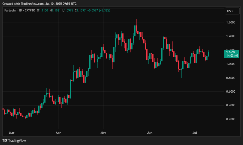 In 2024, a Solana meme coin known as Fartcoin (FARTCOIN) with integrated “fart” humor for transactions was introduced. peaked on January 19, 2025, at $2.62.