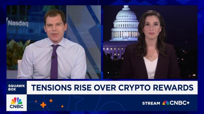 The crypto industry is taking on big banks as lawmakers in Washington debate the future of digital currency regulation. CNBC’s Emily Wilkins joins ‘Squawk Box’ with more.