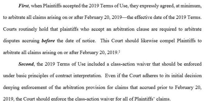 “The Court should hold that Plaintiffs are required to arbitrate claims that accrued after Feb. 20, 2019, even if the Court adheres to its initial decision as to claims that accrued before then and that the class-action waiver in the 2019 Terms of Use is enforceable for all of Plaintiffs’ claims,” Binance said.