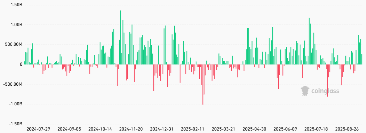 Additional support at the $115,000 mark comes from ongoing accumulation through spot Bitcoin exchange-traded funds (ETFs). This trend has helped restore investor confidence after goldโs 11% outperformance since August. US-listed Bitcoin ETFs recorded $2.2 billion in net inflows between Wednesday and Monday, representing daily buying pressure more than 10 times greater than the amount of new Bitcoin mined each day.