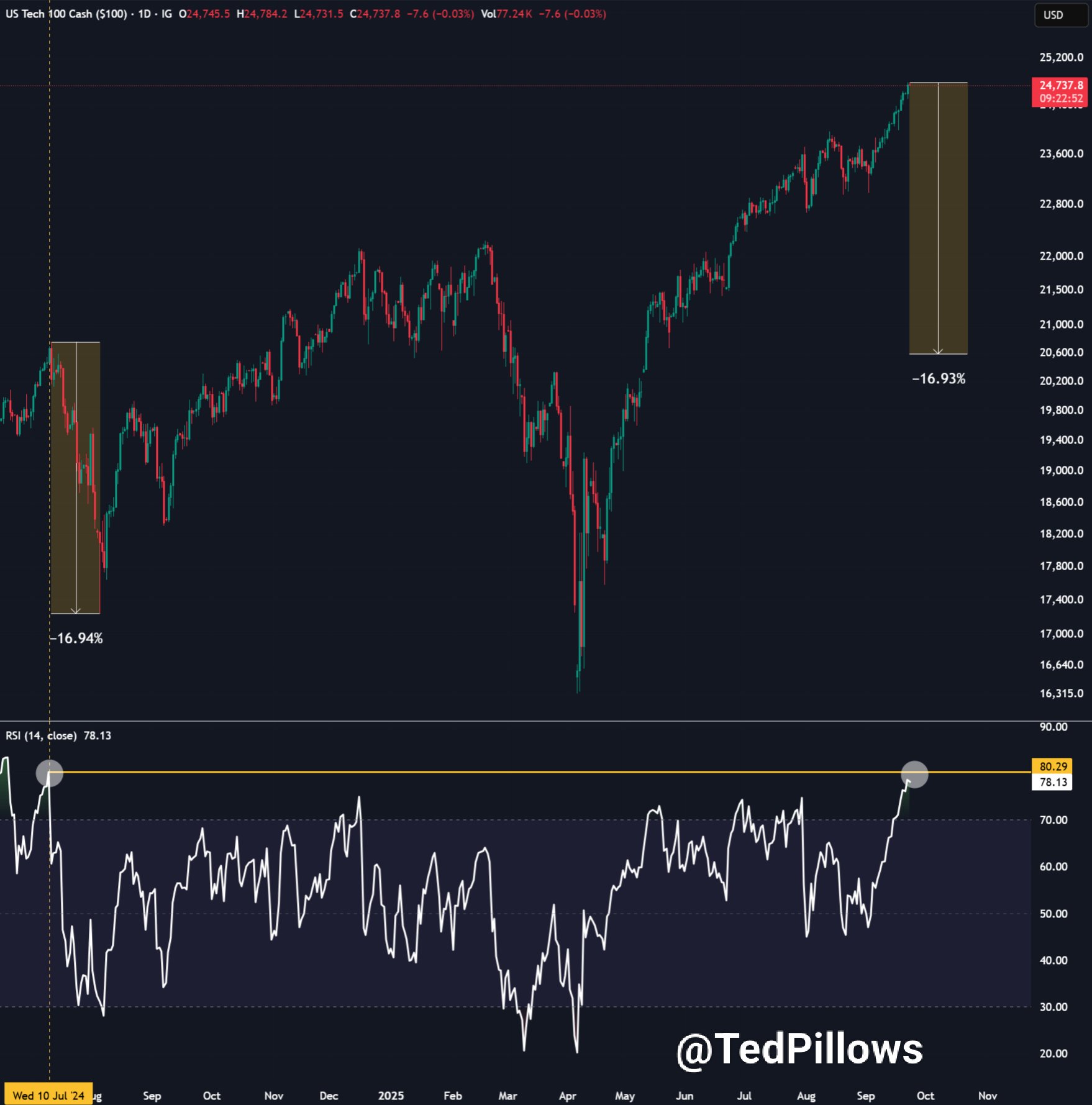 โ$NASDAQ daily RSI has reached 78, its highest level since July 2024,โ he observed.ย