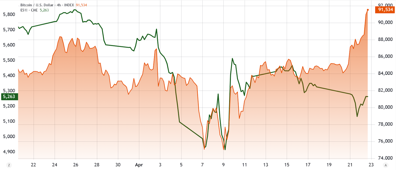 Bitcoin (BTC) surged to a 45-day high above $91,000 on April 22, and the upward movement coincided with gold reaching a new all-time high. The price gains reflect investors’ concerns over a potential economic recession amid ongoing global trade tensions.