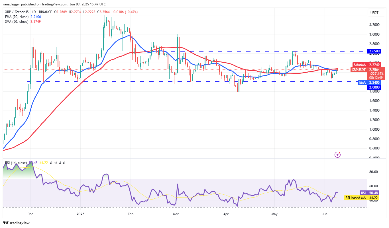 The flattish moving averages and the RSI near the midpoint do not give a clear advantage either to the bulls or the bears. If the price rises above the moving averages, the XRP/USDT pair could ascend to the $2.65 overhead resistance.