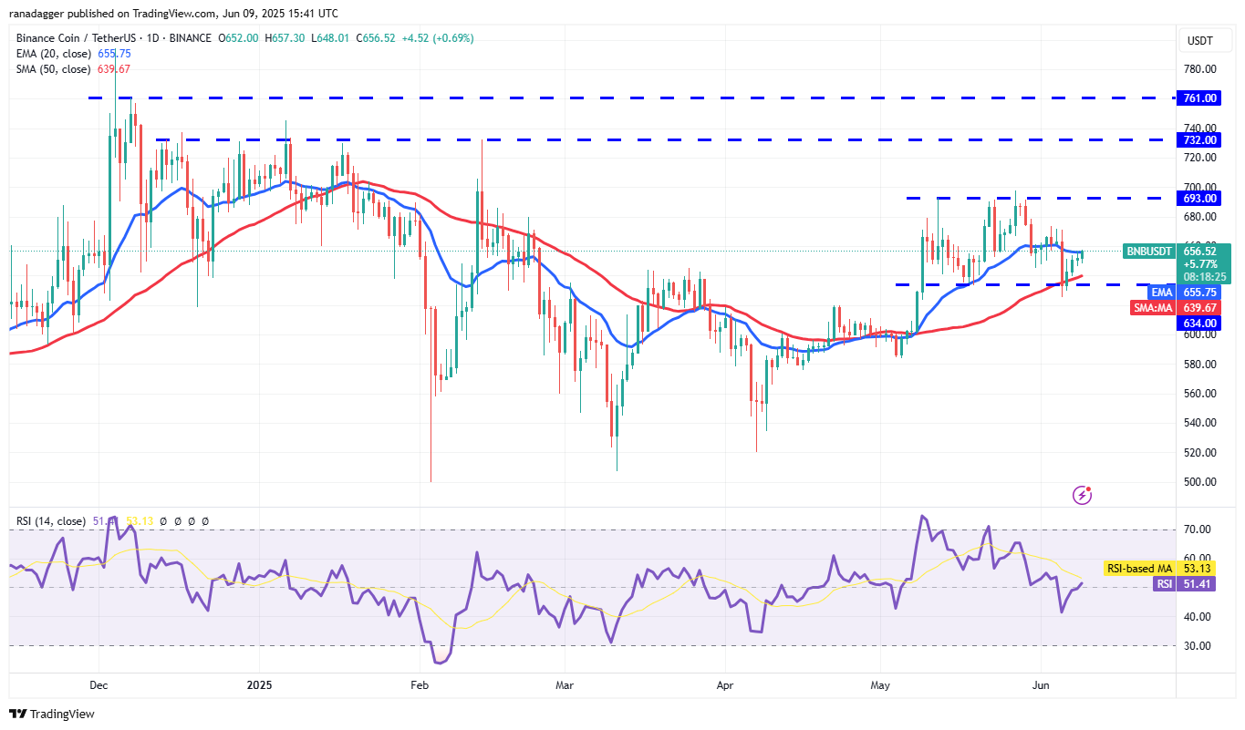 If buyers drive the price above the 20-day EMA ($655), the BNB/USDT pair could extend its stay inside the range for some more time. The next leg of the up move could begin after buyers shove the price above $693. The pair could then rally to $732.