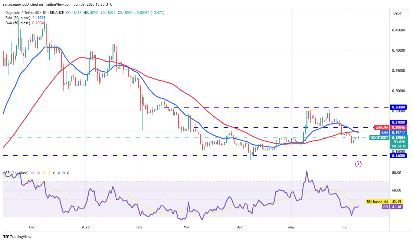 The downsloping 20-day EMA ($0.19) and the RSI in the negative territory indicate that bears have an edge. Sellers will try to pull the price below $0.16, challenging the crucial $0.14 support. Buyers are expected to mount a strong defense at the $0.14 level, keeping the DOGE/USDT pair inside the range for some more time.