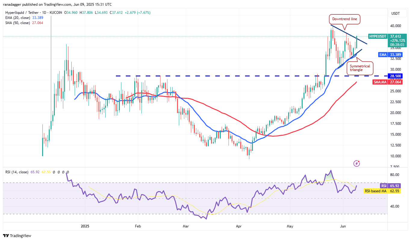 If buyers sustain the price above the triangle, the HYPE/USDT pair could pick up momentum and soar to $42.50. There is resistance at $40, but that is likely to be crossed. Sellers will try to halt the up move at $42.50, but if the bulls prevail, the pair could rally to the pattern target of $46.50.