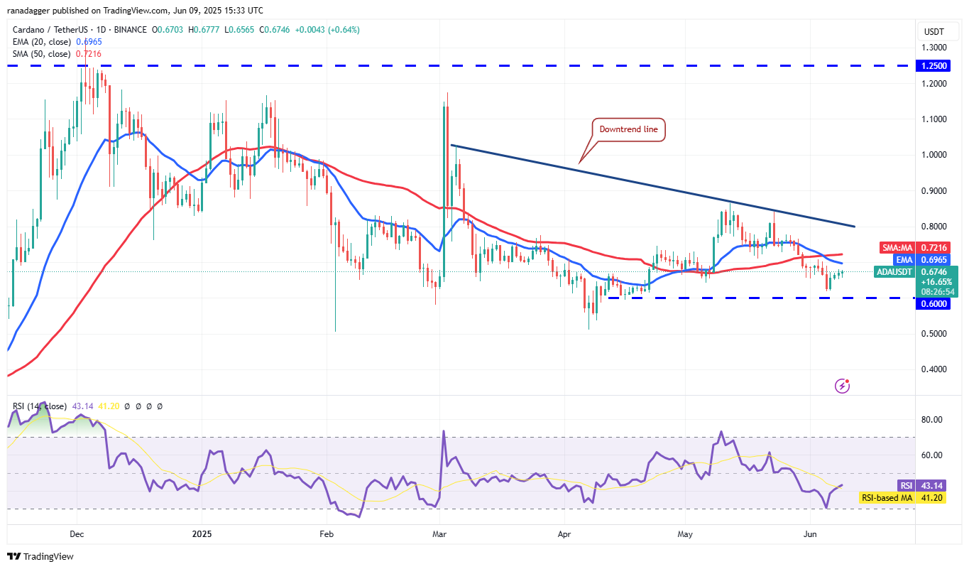 Cardano’s (ADA) recovery is facing resistance near the 20-day EMA ($0.69), indicating that the bears are selling on rallies.
