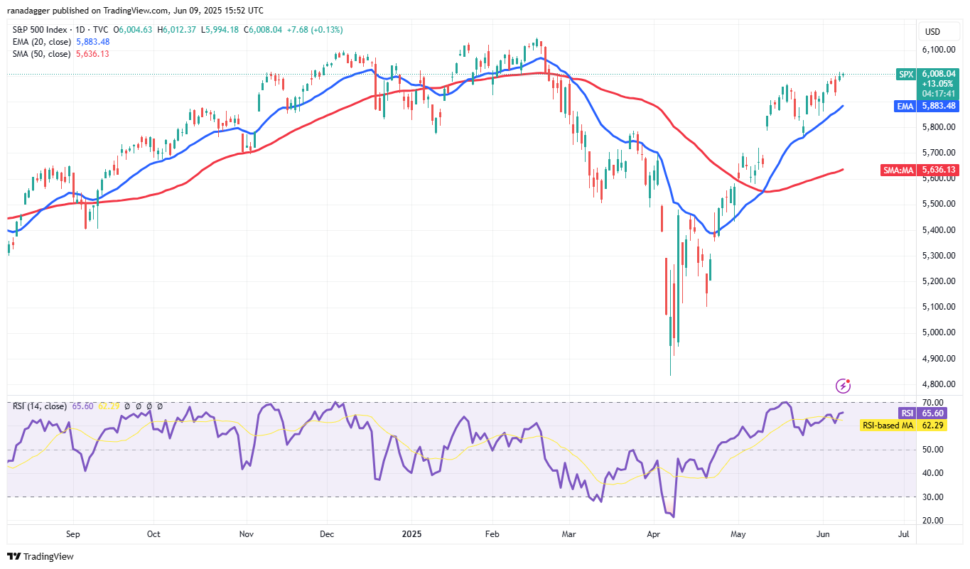 The upsloping 20-day exponential moving average (5,883) and the relative strength index (RSI) in the positive territory indicate that the bulls are in command. Buyers will try to push the price to the 6,147 overhead resistance.