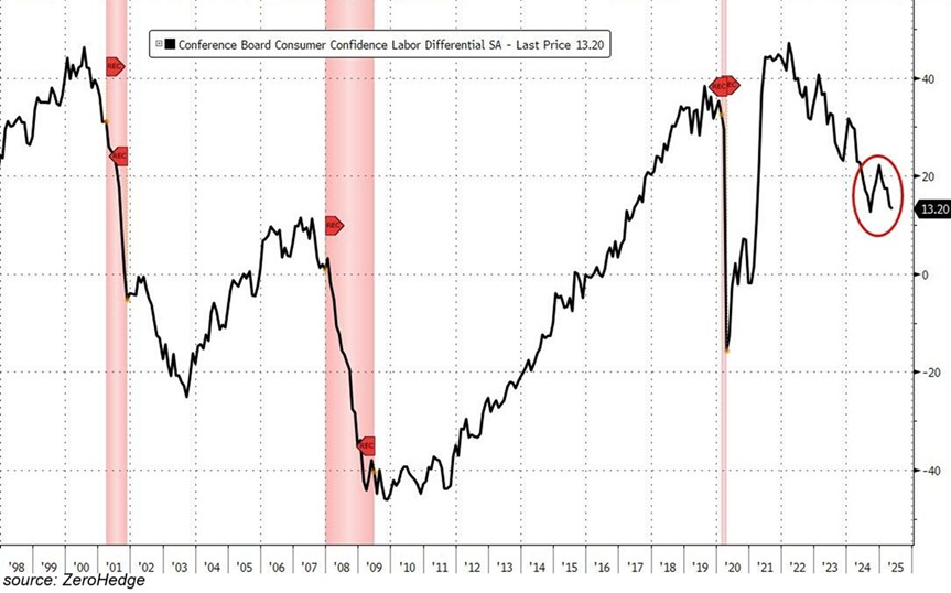 Consumer sentiment over the labor market, it reported, was flashing classic signs of a forthcoming unemployment spike โ something which could force the Fed to bring rate cuts forward.