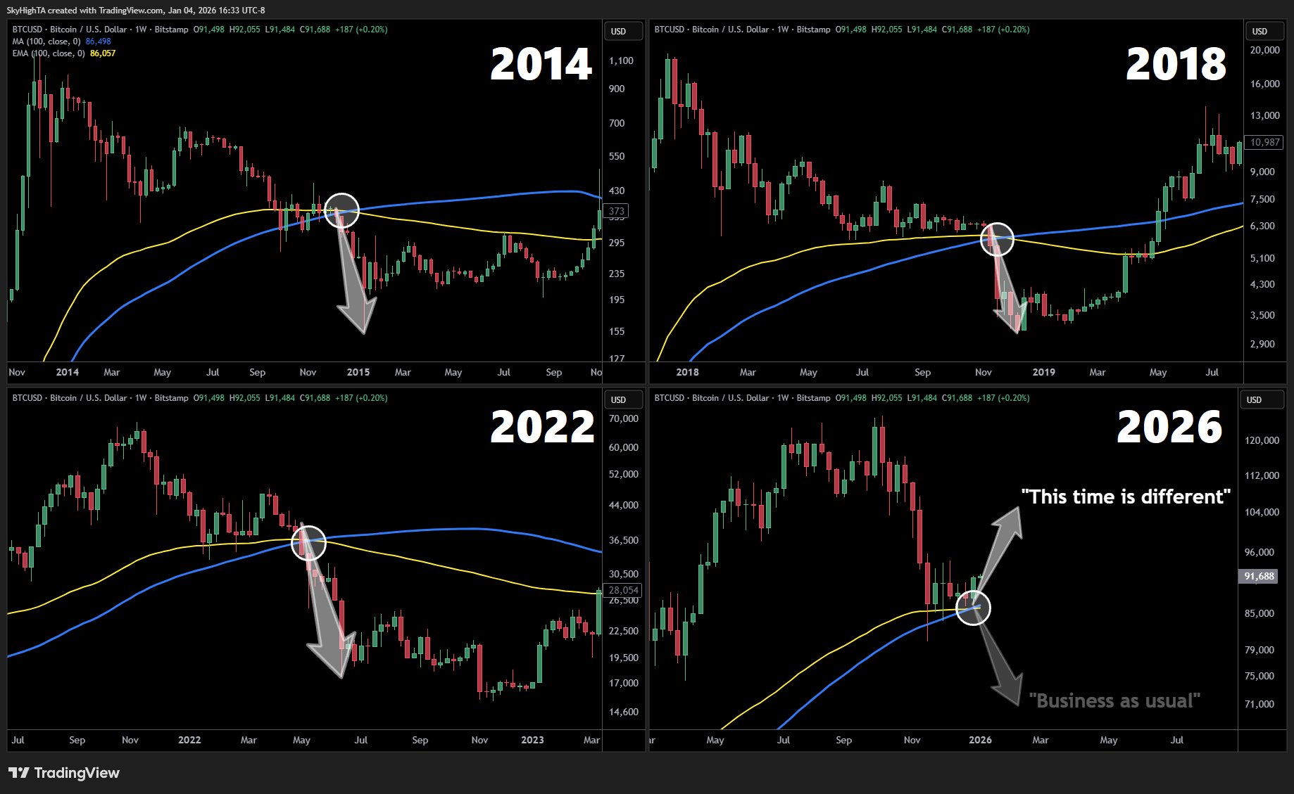 In previous Bitcoin bear markets, the 100-week EMA crossing under the 100-week SMA came at the start of major BTC price downside — but 2026 is proving to be different.