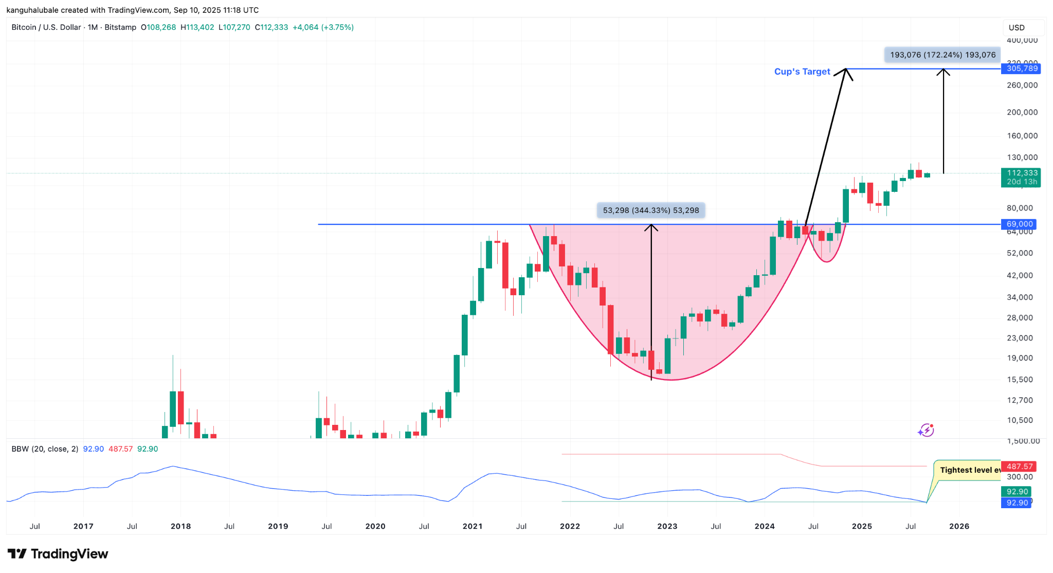 That puts Bitcoin’s cup-and-handle breakout target for 2025–2026 at around $305,000, up by more than 170% from current price levels.