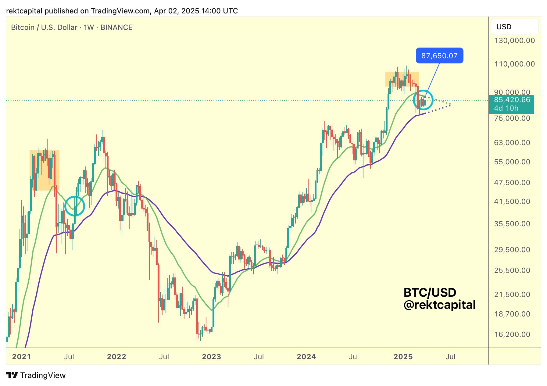 BTC/USD 1-week chart with 21, 50 EMA. Source: Rekt Capital/X